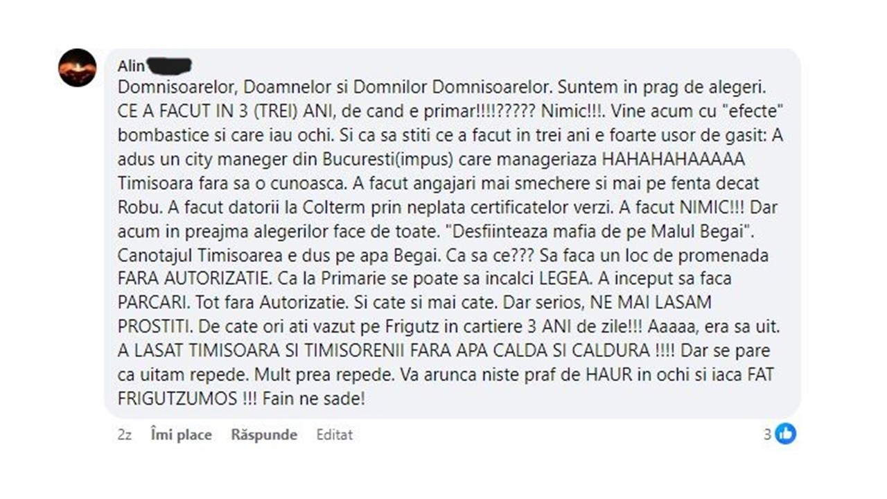 „Seara mă înjură pe Facebook, ziua îmi dă amenzi. Javră. Infect. Necuratule. Dute (!) la Pădurea Neagră. Doar câteva din înjurături lăsate de-a lungul timpului pe pagina mea de Facebook de un angajat al Inspectoratului de Stat în Construcții. Care, după ce mă înjură, este trimis oficial în controale la Primărie și dă amenzi absurde. Povestea aceasta putea să fie despre un om cu ușoare probleme de comportament. Dar aici nu e vorba de o răfuială personală. Este de fapt despre politizarea unor instituții de stat, care folosesc astfel de angajați pentru hărțuire oficială. Am sesizat cazul la ISC încă de anul trecut. Nicio reacție. Nicio anchetă. Nicio asumare. Dimpotrivă: angajatul este trimis în continuare să-mi controleze activitatea”, a semnalat primarul Timișoarei, într-o postare pe Facebook.