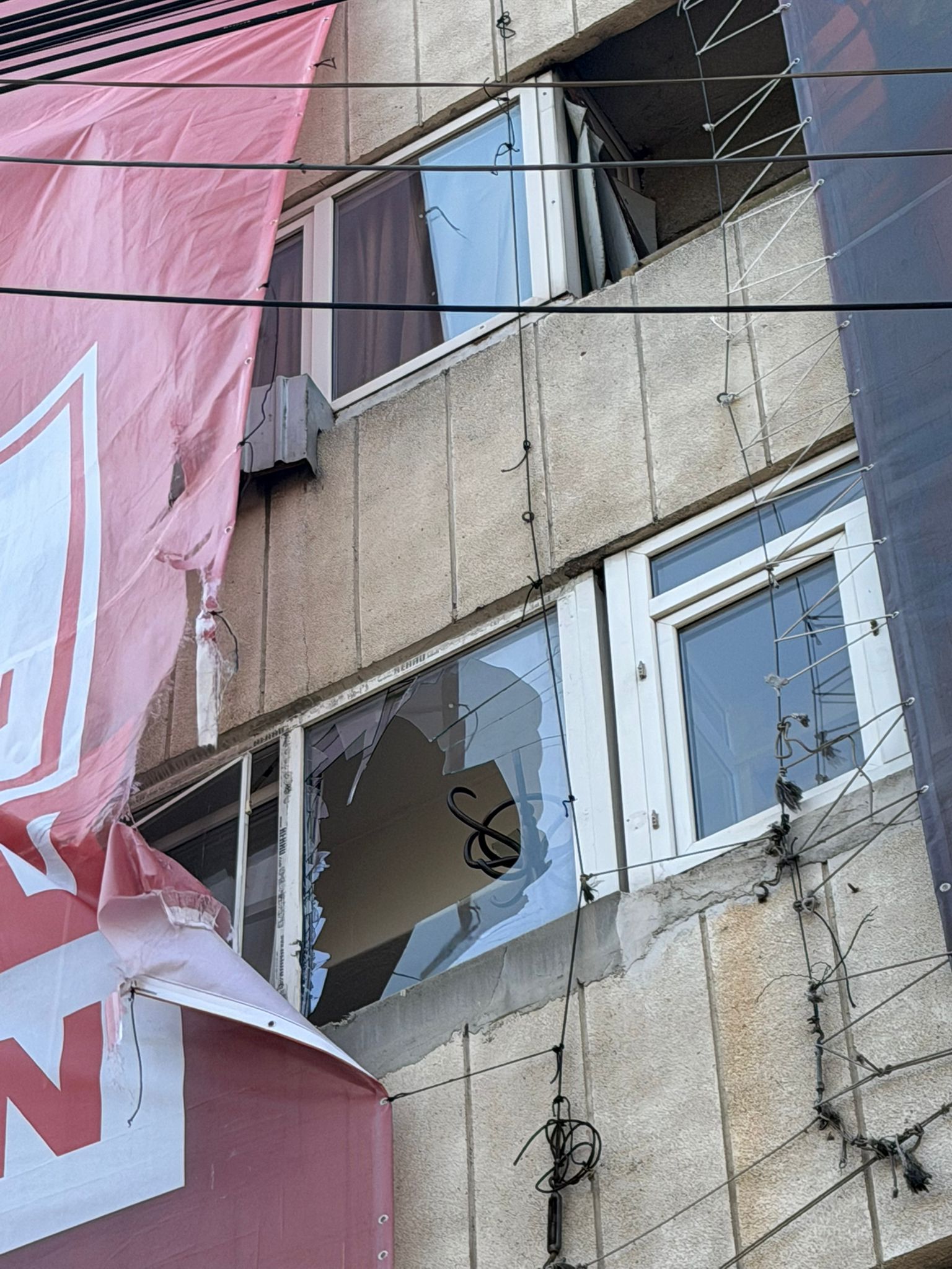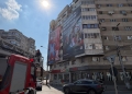 La un pas de tragedie! Bucăți dintr-un bloc, puse la pământ de un mesh publicitar