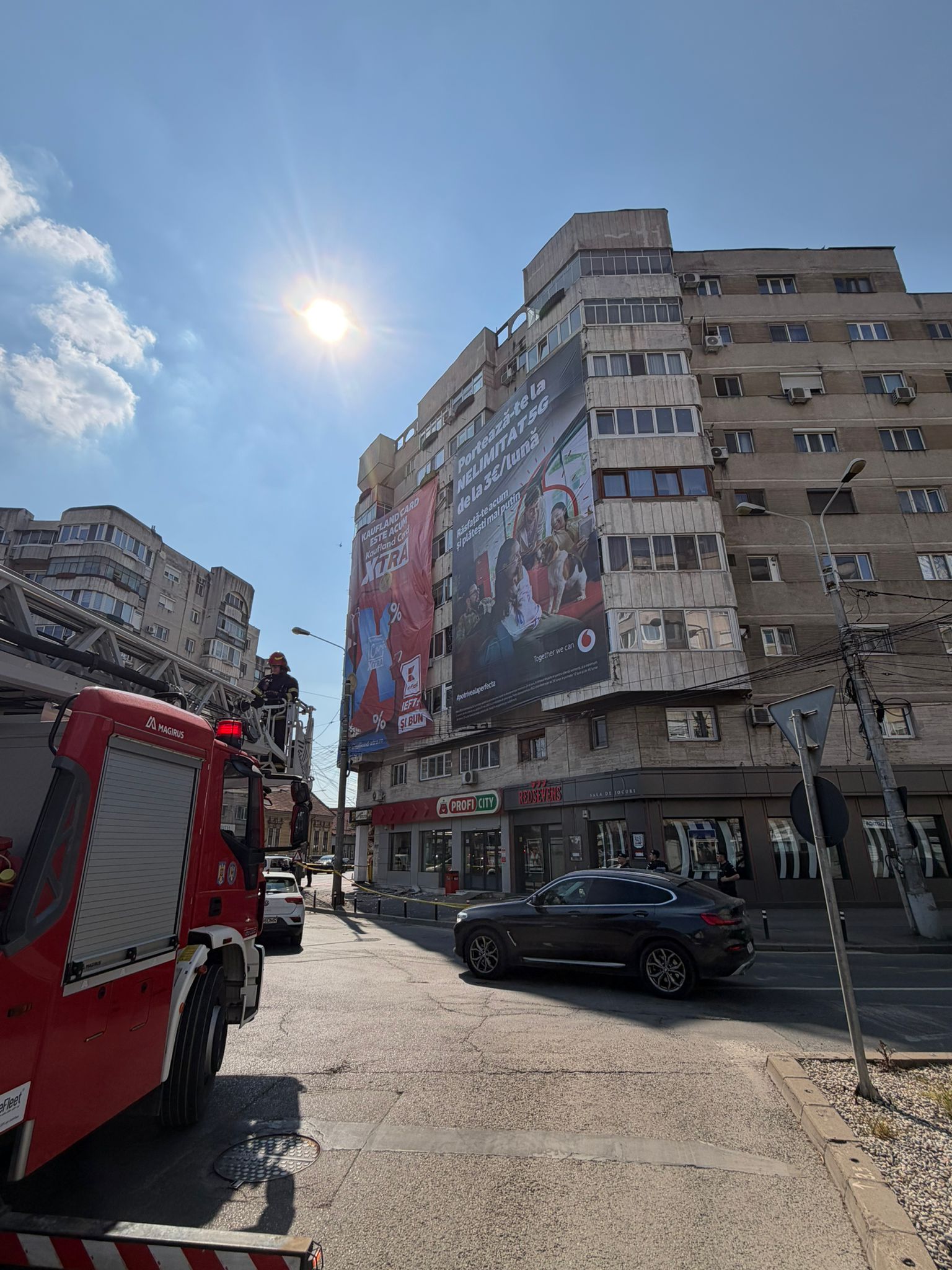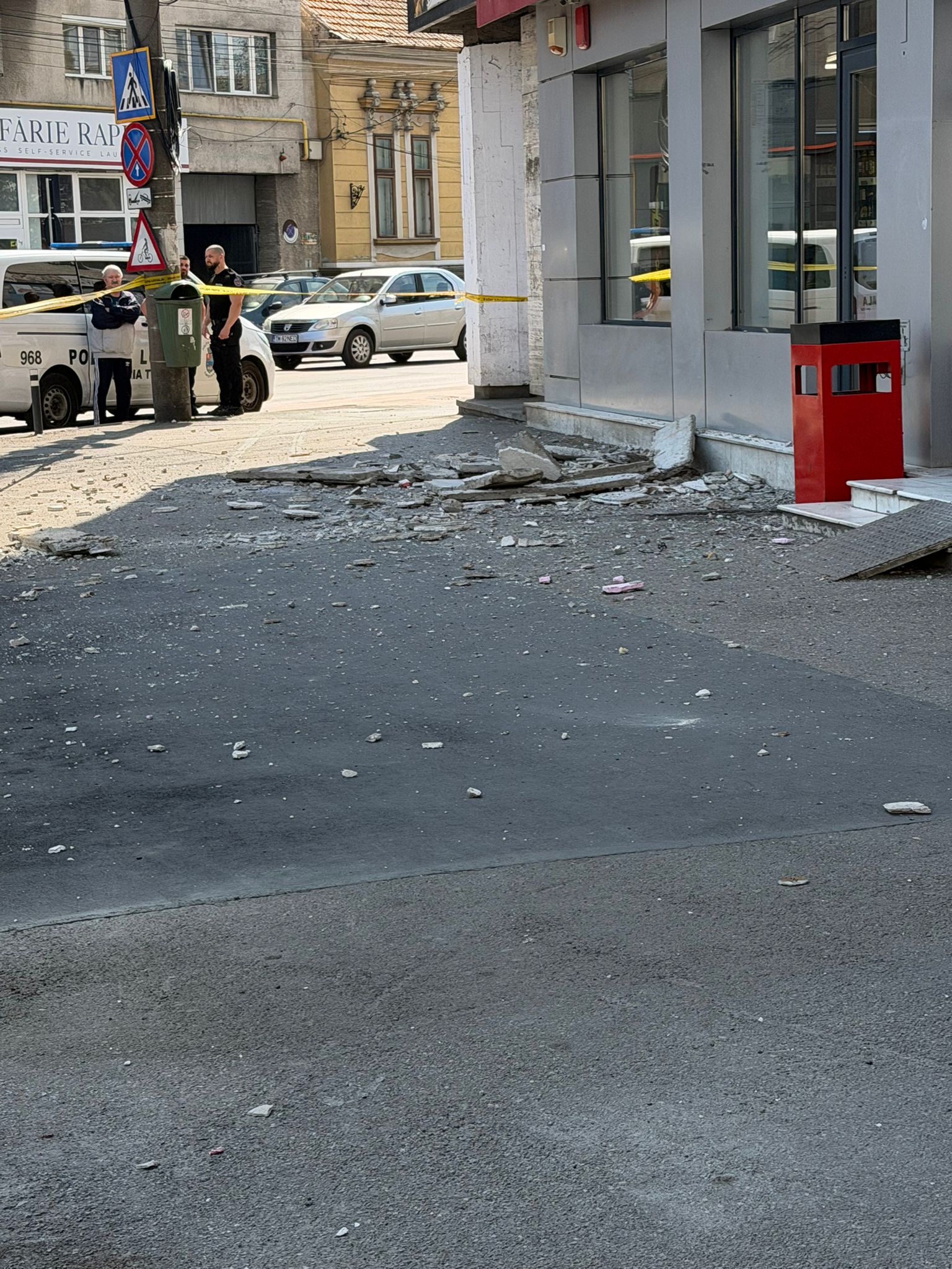 Echipele Poliției Locale au intervenit pentru punerea în siguranță a zonei și au solicitat sprijinul ISU pentru a îndepărta bucăți din fațadă care aveau potențial de a cauza alte daune.