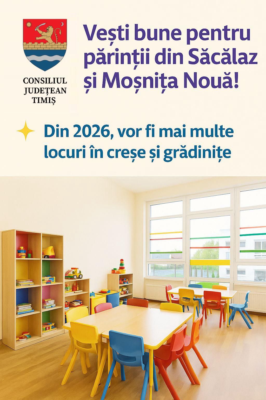 Din 2026, părinții din Săcălaz și Moșnița Nouă vor avea mai multe locuri pentru copiii lor în creșe și grădinițe.