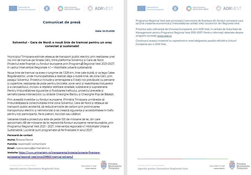 Prin această investiție cu fonduri europene, Primăria Timișoara urmărește să îmbunătățească conectivitatea între zona Solventul, Gara de Nord și rețeaua de transport public existentă, să reducă emisiile de carbon prin promovarea transportului electric și nemotorizat și să crească siguranța și accesibilitatea în trafic pentru toți participanții, fie ei pietoni, bicicliști sau călători.