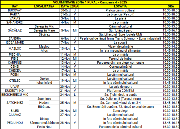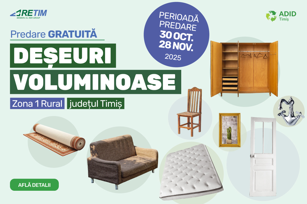 Ultima campanie de predare gratuită a deșeurilor voluminoase din 2025 va avea loc în în Bucovăț, Parța, Variaș, Sânandrei, Săcălaz (și în Beregsău Mic și Beregsău Mare), Șandra, Iecea Mare, Mașloc (și în Alioș), Pișchia, Fibiș, Cărpiniș, Cenei, Checea, Foeni, Otelec (și în Iohanisfeld), Uivar, Dudeștii Noi, Becicherecu Mic, Satchinez (și în Hodoni și Bărăteaz), Biled, Giulvăz și Peciu Nou (și în Diniaș și Sânmartinul Sârbesc).