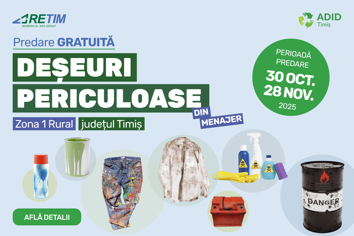 RETIM și ADID Timiș organizează a patra campanie de predare gratuită a deșeurilor periculoase din menajer din 2025 în Zona 1 Rural a județului Timiș.
