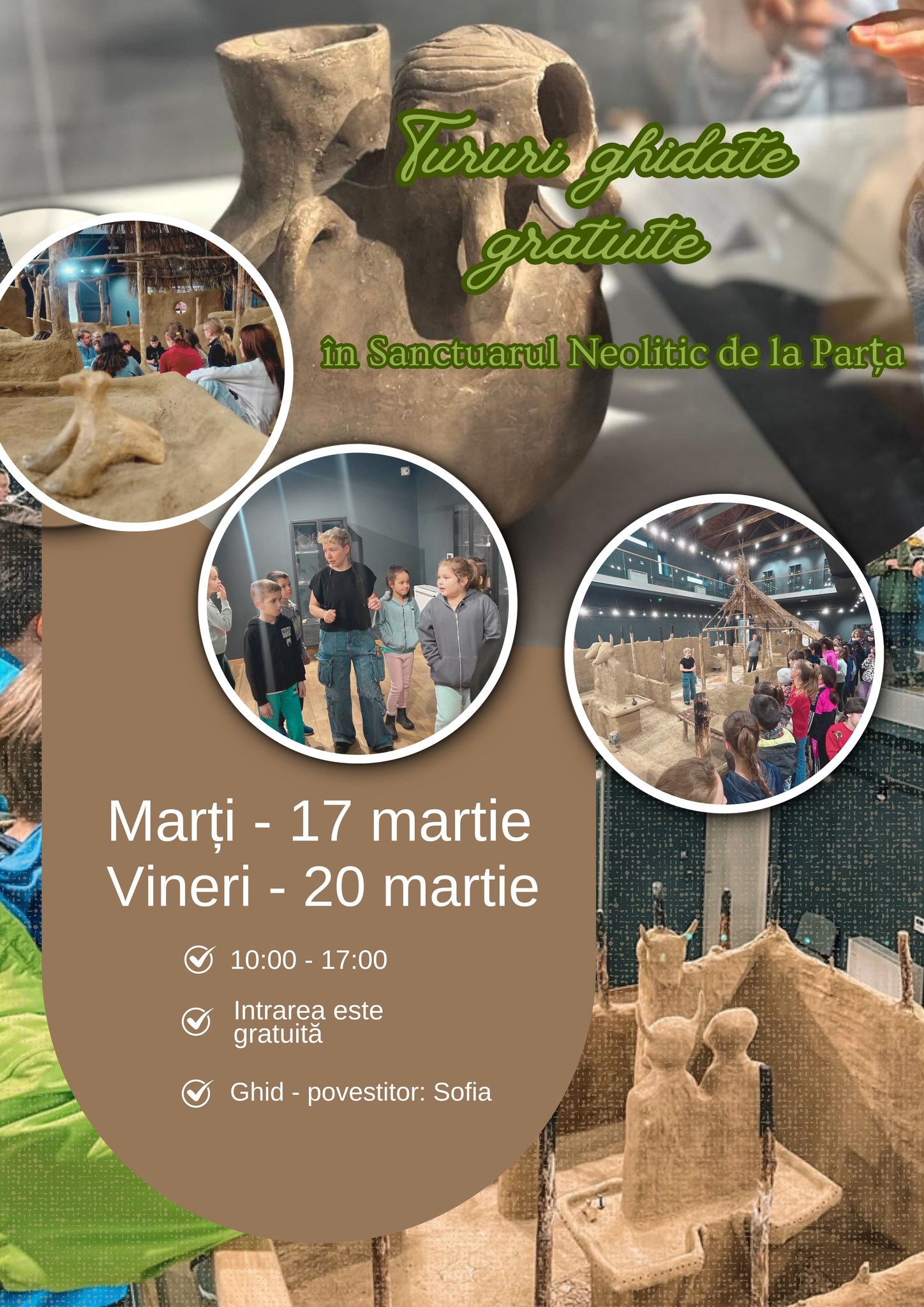 „Colega noastră Sofia conduce tururile prin lectura arheologică a sanctuarului. Organizarea spațiului, descoperirile de la Parța și interpretările specialiștilor asupra funcției sale rituale devin repere clare pentru înțelegerea uneia dintre cele mai importante descoperiri neolitice din Banat. Explicațiile sunt adaptate astfel încât și copiii să poată păși firesc în această lume veche de milenii. Vă așteptăm de la 10:00 – 17:00. Intrarea este gratuită”, a transmis Muzeul Național al Banatului.