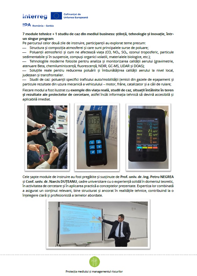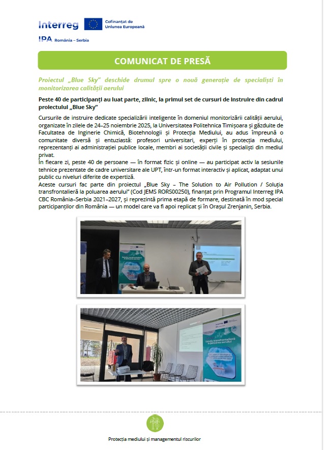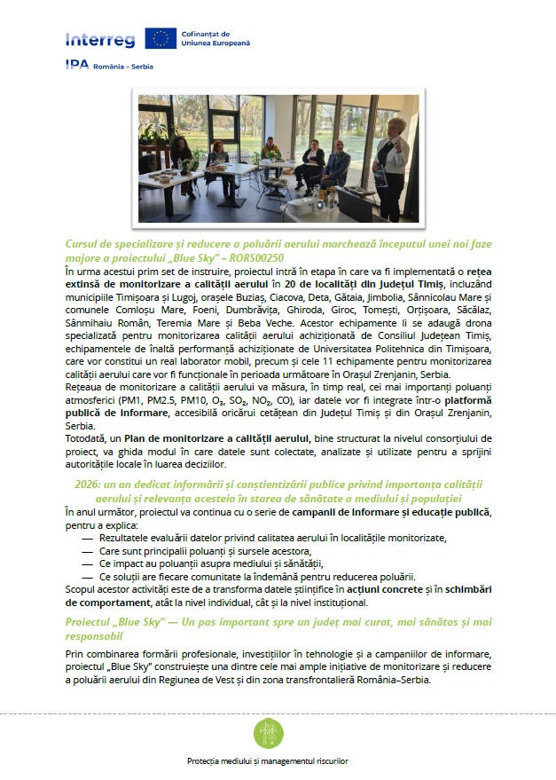 Aceste cursuri fac parte din proiectul „Blue Sky – The Solution to Air Pollution / Soluția transfrontalieră la poluarea aerului” (Cod JEMS RORS00250), finanțat prin Programul Interreg IPA CBC România–Serbia 2021–2027, și reprezintă prima etapă de formare, destinată în mod special participanților din România — un model care va fi apoi replicat și în Orașul Zrenjanin, Serbia.