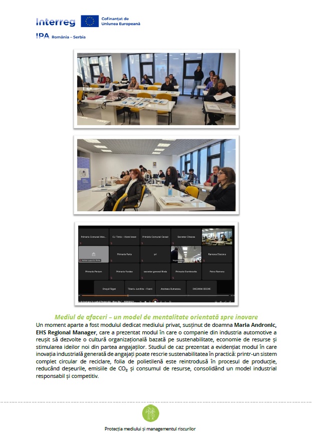 Un moment aparte a fost modulul dedicat mediului privat, susținut de doamna Maria Andronic, EHS Regional Manager, care a prezentat modul în care o companie din industria automotive a reușit să dezvolte o cultură organizațională bazată pe sustenabilitate, economie de resurse și stimularea ideilor noi din partea angajaților. Studiul de caz prezentat a evidențiat modul în care inovația industrială generată de angajați poate rescrie sustenabilitatea în practică: printr-un sistem complet circular de reciclare, folia de polietilenă este reintrodusă în procesul de producție, reducând deșeurile, emisiile de CO₂ și consumul de resurse, consolidând un model industrial responsabil și competitiv.