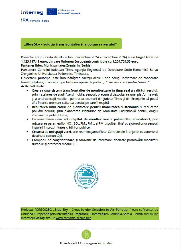Proiectul RORS00250: „Blue Sky – Cross-border Solution to Air Pollution” este cofinanțat de Uniunea Europeană prin intermediul Programului Interreg IPA România-Serbia. Pentru mai multe informații vizitați site-ul: www.romania-serbia.net „Blue Sky – Soluția transfrontalieră la poluarea aerului