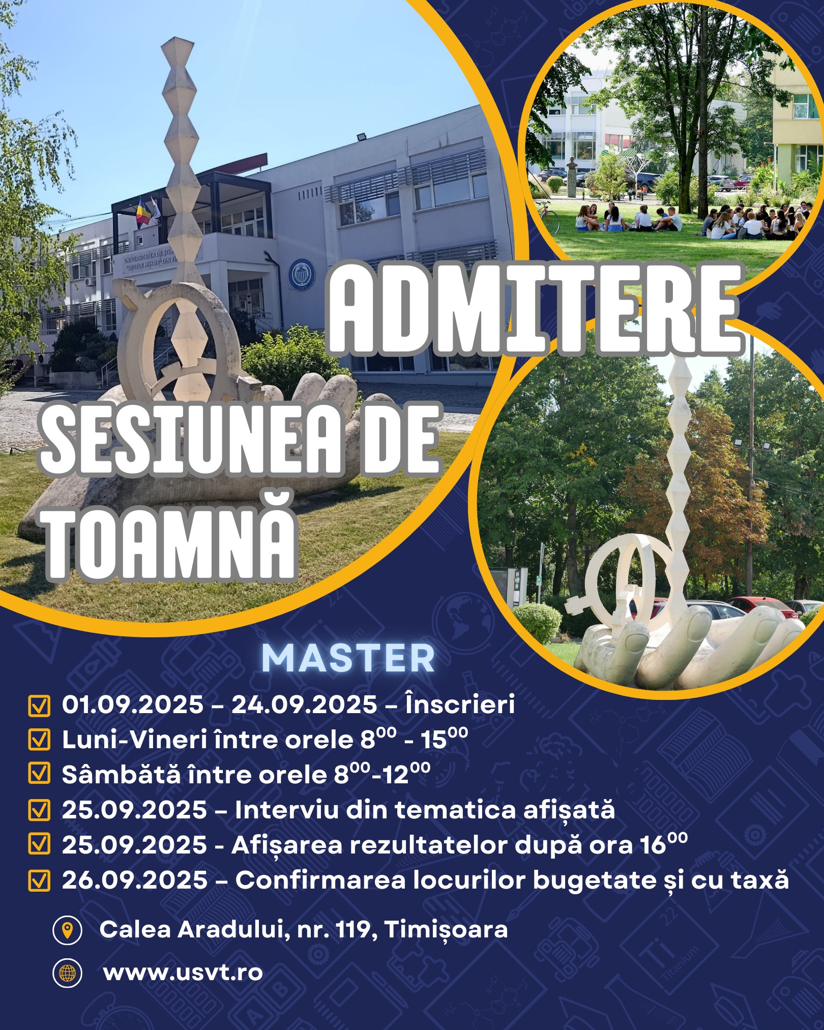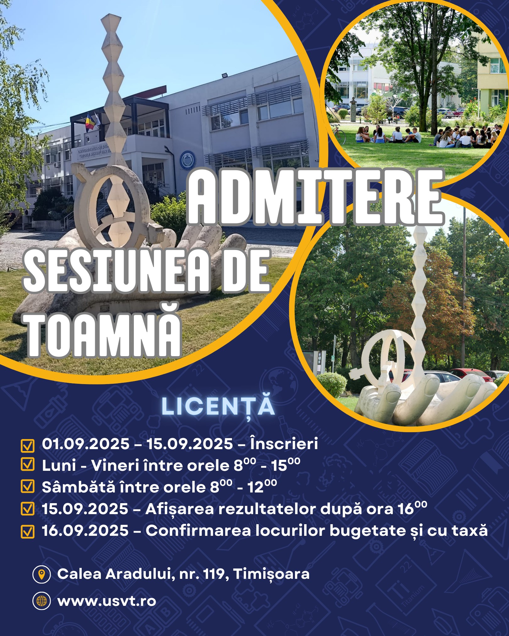 Detalii și înscrieri pe site-ul oficial al universității sau direct la sediul universității: Calea Aradului nr. 119, Timișoara.