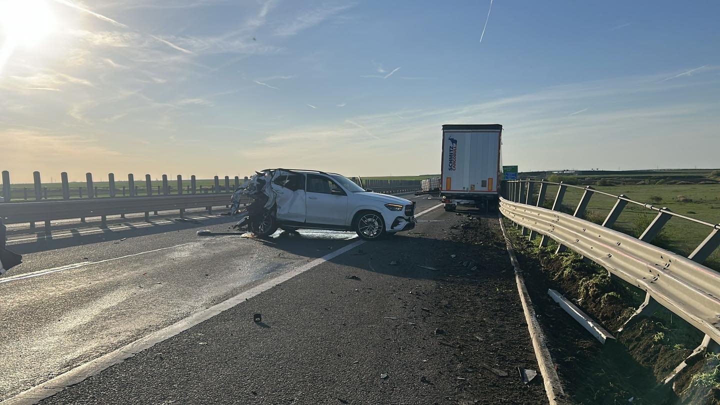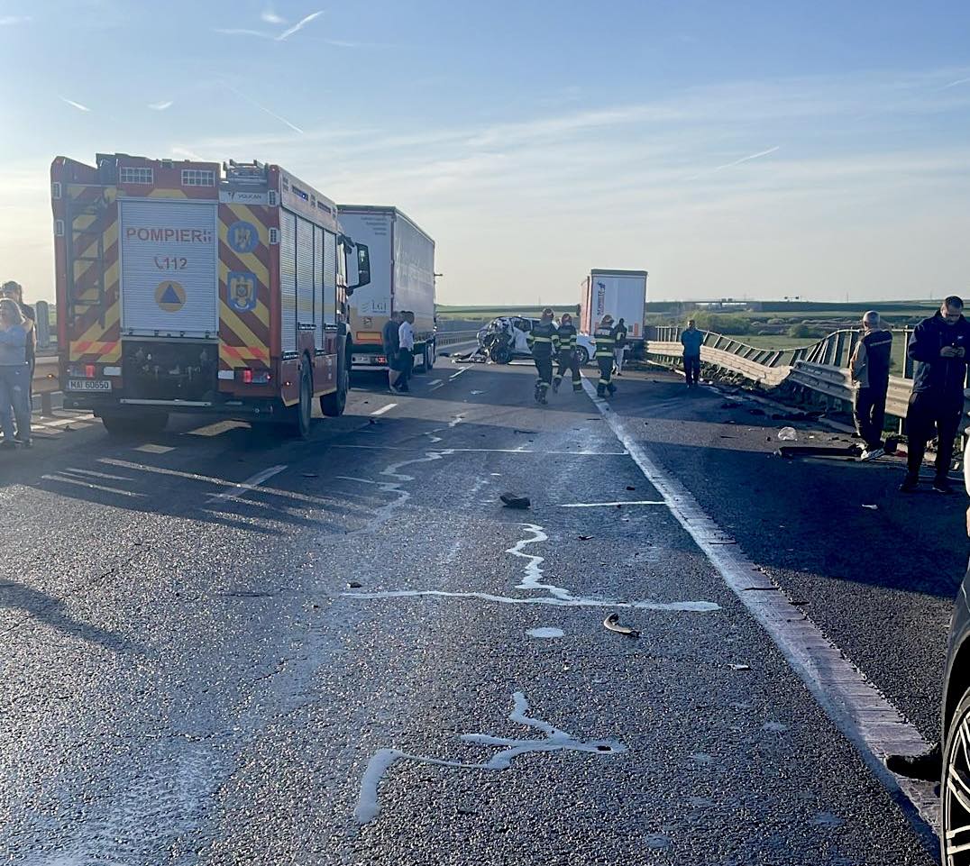„La data de 06 aprilie 2026, în jurul orei 18:25, pe autostrada A1 Deva-Nădlac, a avut loc un accident pe sensul de mers dinspre localitatea Giarmata înspre municipiul Arad, între un autoturism condus de un bărbat de 56 de ani și un autocamion condus de un bărbat de 36 de ani. În urma impactului, o persoană a decedat, respectiv bărbatul de 56 de ani, iar o femeie de 50 de ani a fost rănită și transportată la spital pentru îngrijiri medicale de specialitate”, a informat Poliția Timiș.
