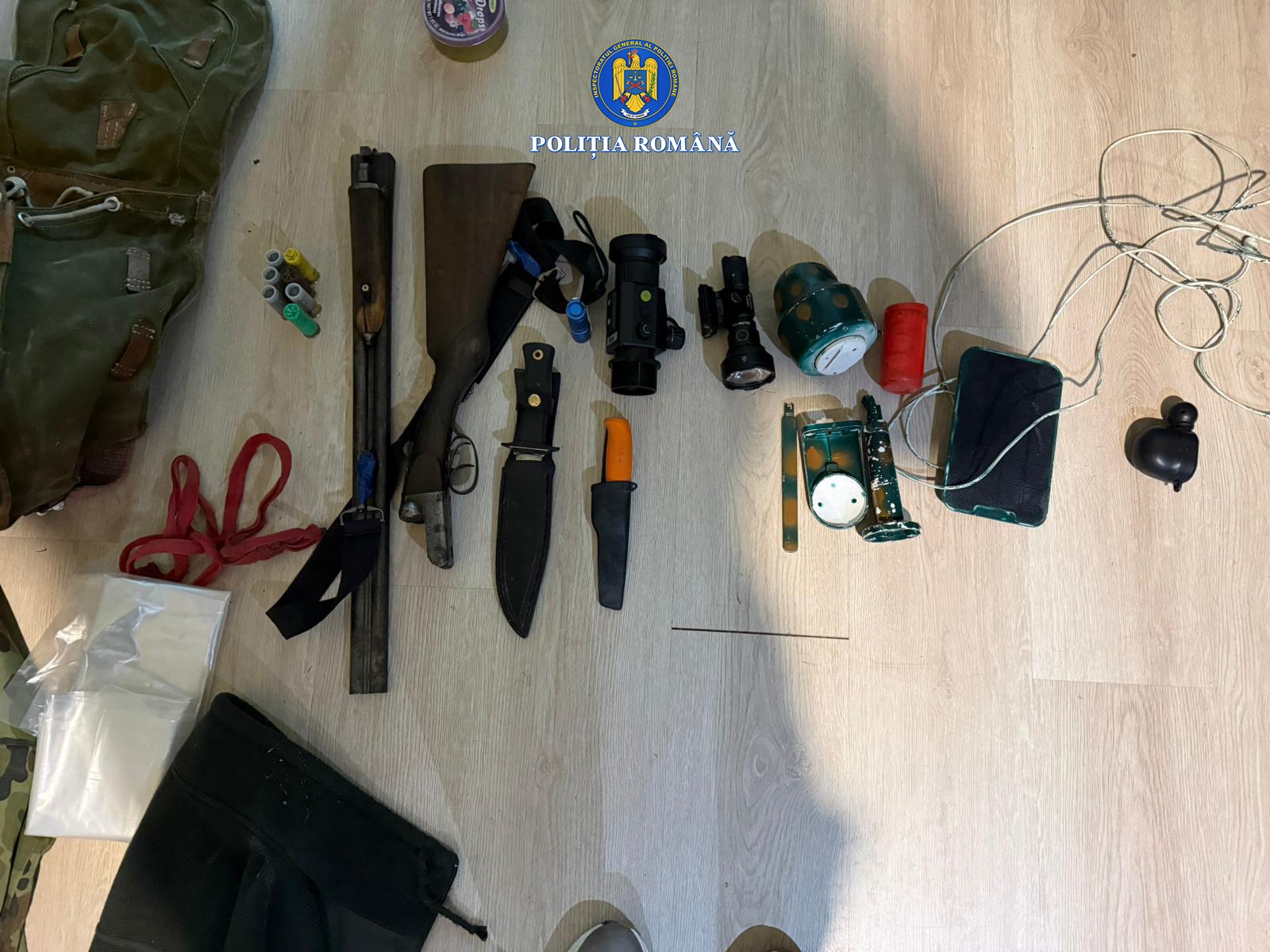 În urma perchezițiilor domiciliare, au fost descoperite și ridicate arme de vânătoare, muniție, dispozitive de supraveghere, echipamente de termoviziune, carne de vânat și accesorii utilizate la activitățile de braconaj.