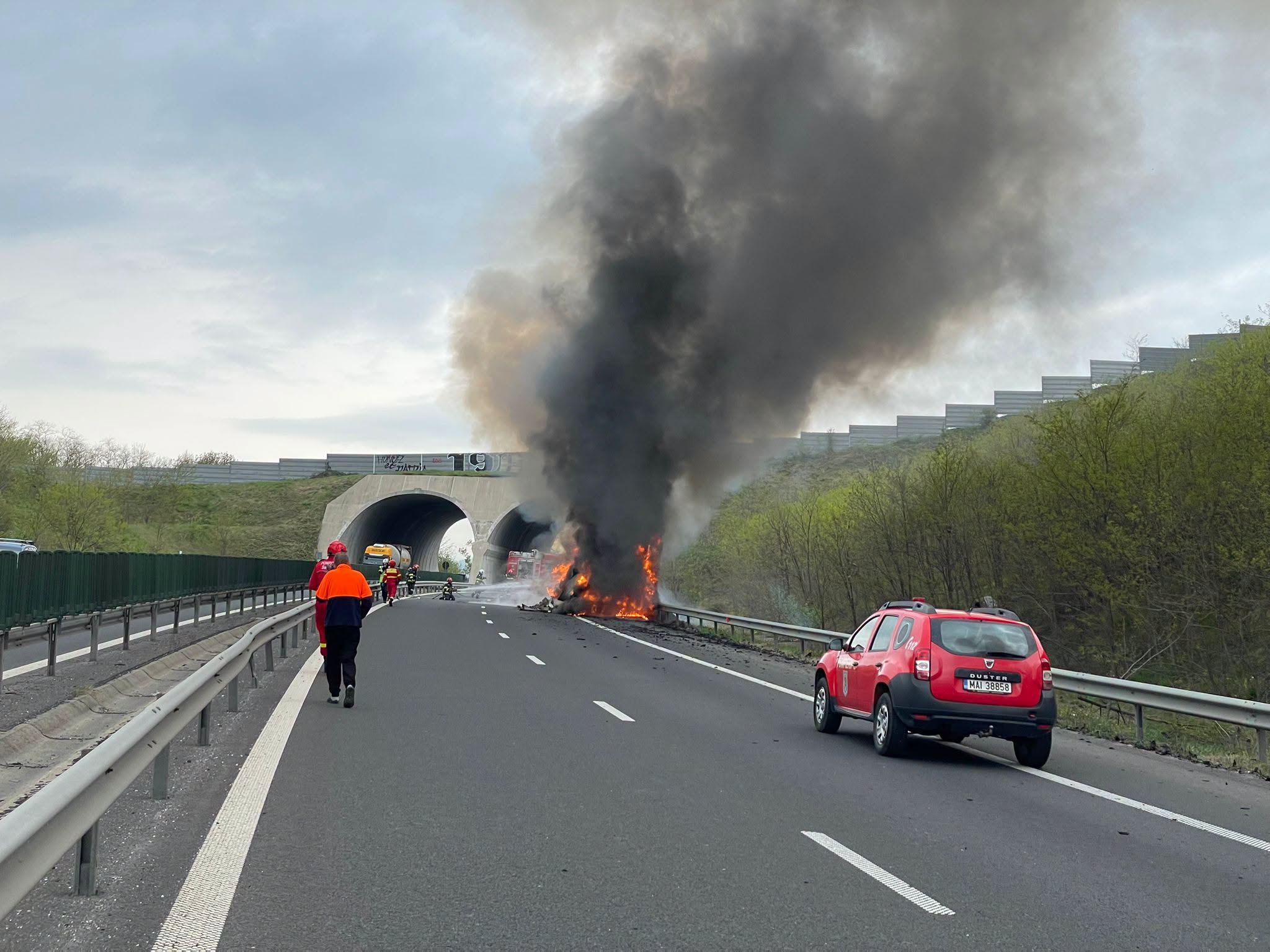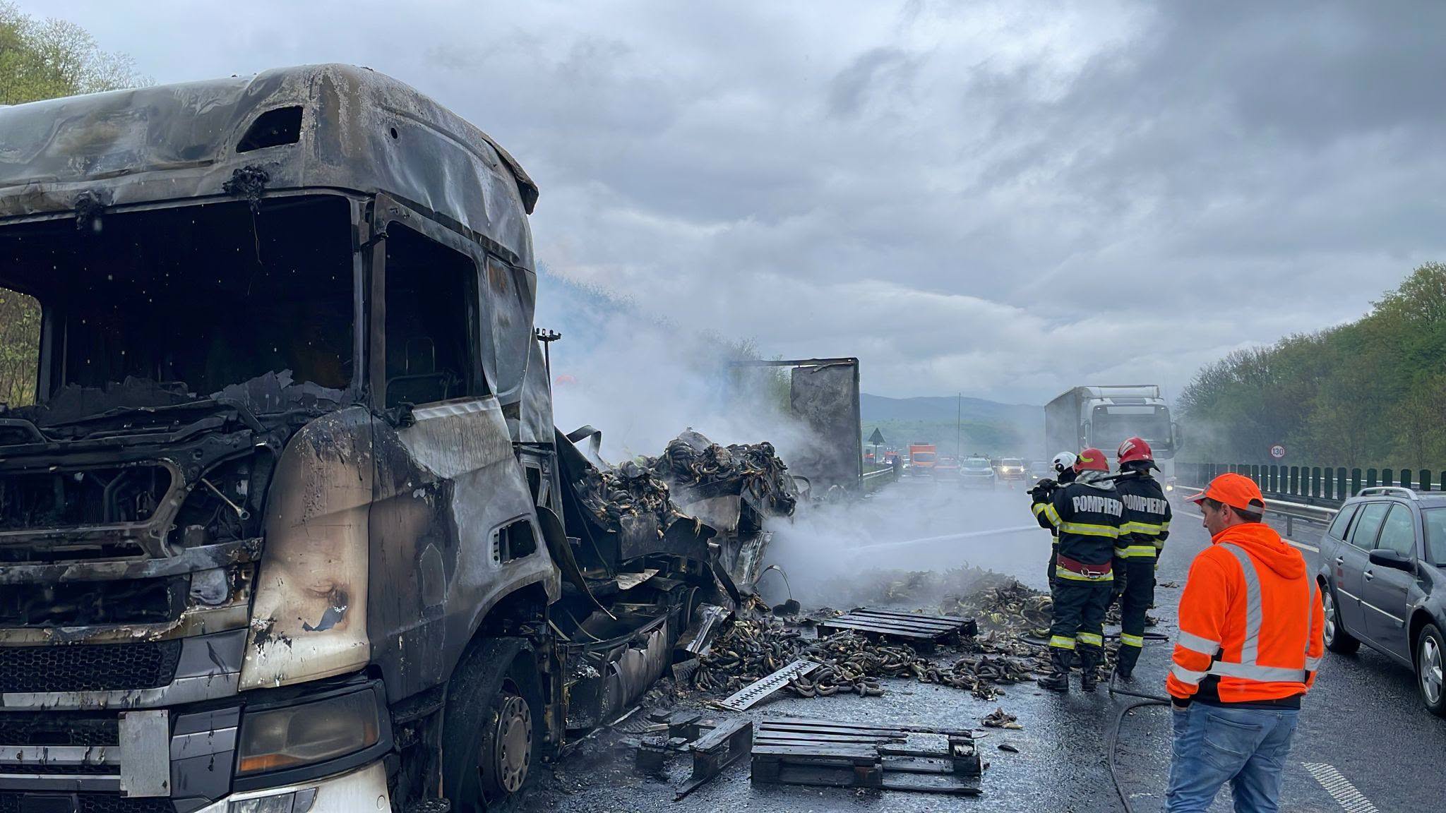„Intervenție pentru stingerea unui incendiu pe autostrada A1, Brănișca (HD), km 382+500, sensul Deva – Timișoara, la un autocamion care transporta fructe. Traficul este oprit temporar”, a informat Direcția Regională de Drumuri și Poduri Timișoara.