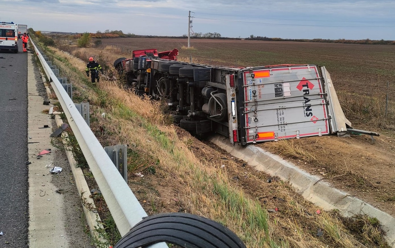 Potrivit Direcției Regionale de Drumuri și Poduri Timișoara, un autotren a lovit parapetul marginal și s-a răsturnat în afara părții carosabile.