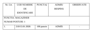 Spitalul Orășenesc Deta anunță rezultatul examenului organizat pentru promovarea în grad/treapta imediat superioară din funcția de magaziner debutant în magaziner, organizat în data de 30 ianuarie 2026.