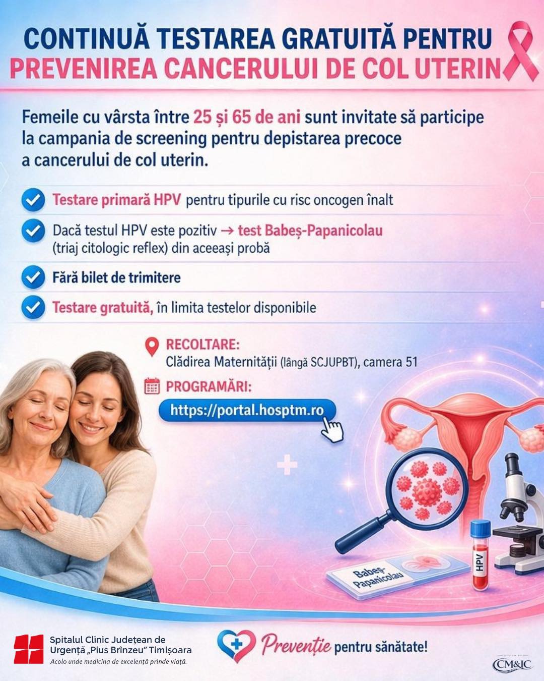 Spitalul Clinic Județean de Urgență „Pius Brînzeu” continuă campania masivă de screening pentru depistarea precoce a cancerului de col uterin. Femeile cu vârsta între 25 și 65 de ani din Timișoara și împrejurimi pot beneficia de analize gratuite de tip HPV și Babeș-Papanicolau, fără a fi nevoie de bilet de trimitere de la medicul de familie.