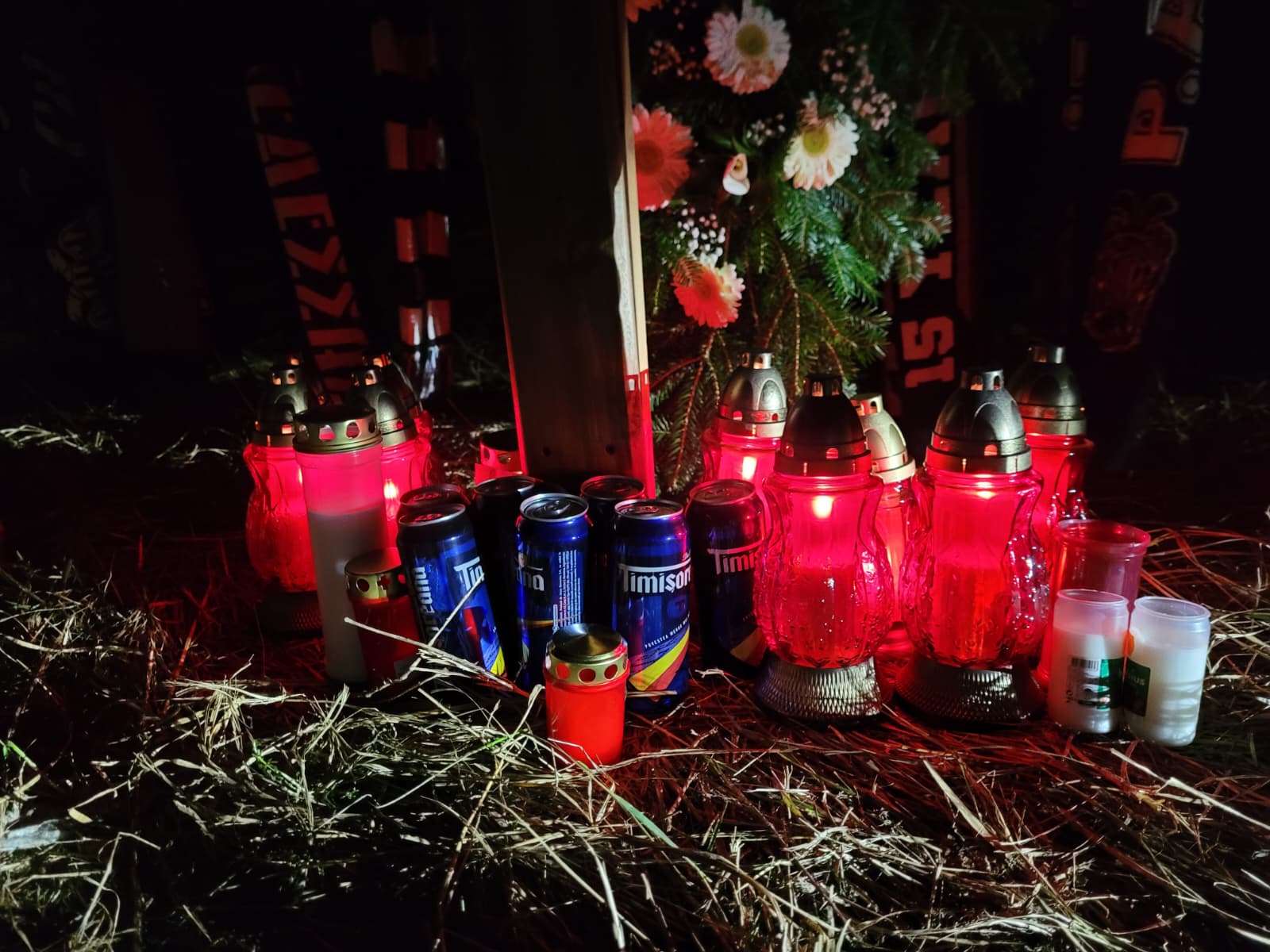 Coroane și beri lăsate de suporterii timișoreni la locul din Timiș unde șapte ultrași greci au murit FOTO