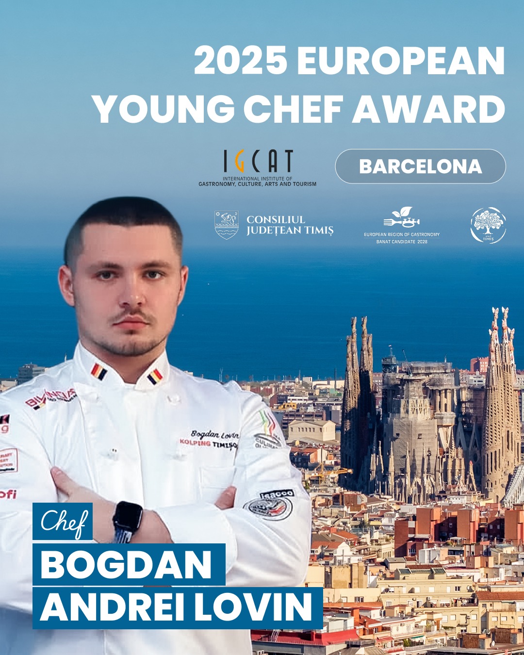 Visit Timiș anunță că tânărul bucătar, Bogdan-Andrei Lovin va reprezenta județul Timiș și Banatul, candidat oficial la titlul de Regiune Gastronomică Europeană 2028, la European Young Chef Award 2025, un concurs organizat de Institutul Internațional de Gastronomie, Cultură, Artă și Turism.